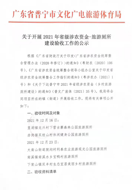 關(guān)于開展2021年省級(jí)涉農(nóng)資金——旅游廁所建設(shè)驗(yàn)收工作的公示