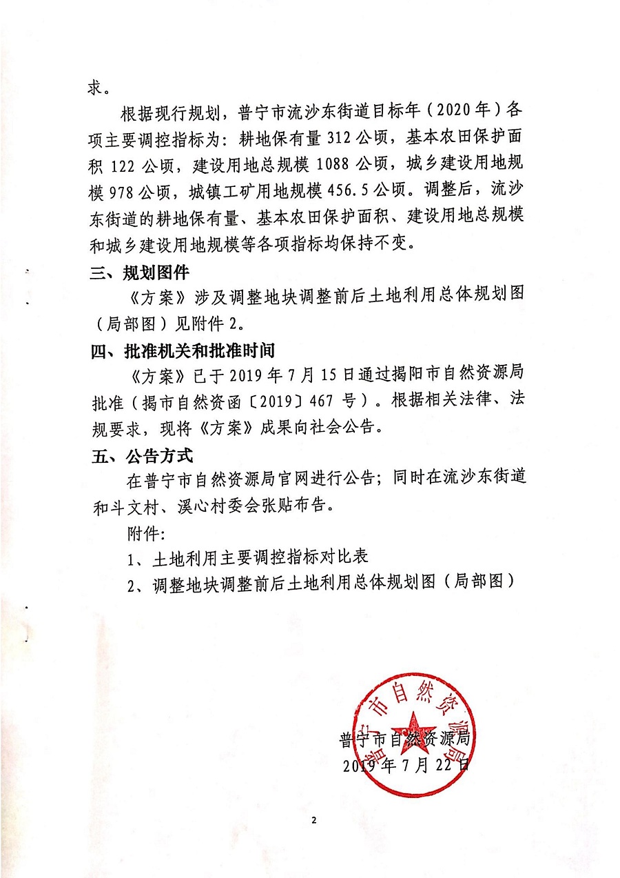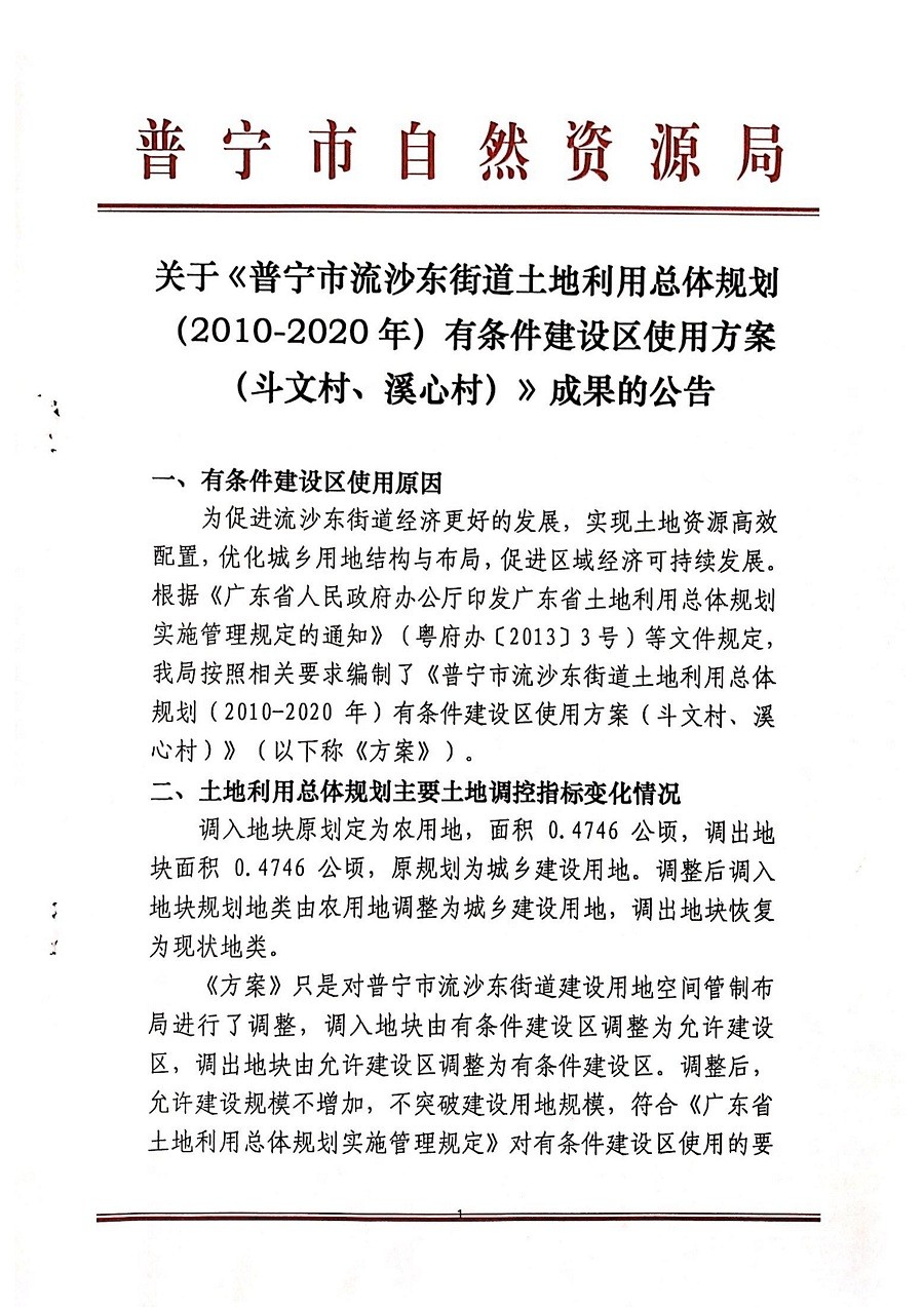 關(guān)于《普寧市流沙東街道土地利用總體規(guī)劃(2010-2020年)有條件建設(shè)區(qū)使用方案 (斗文村、溪心村)》成果的公告
