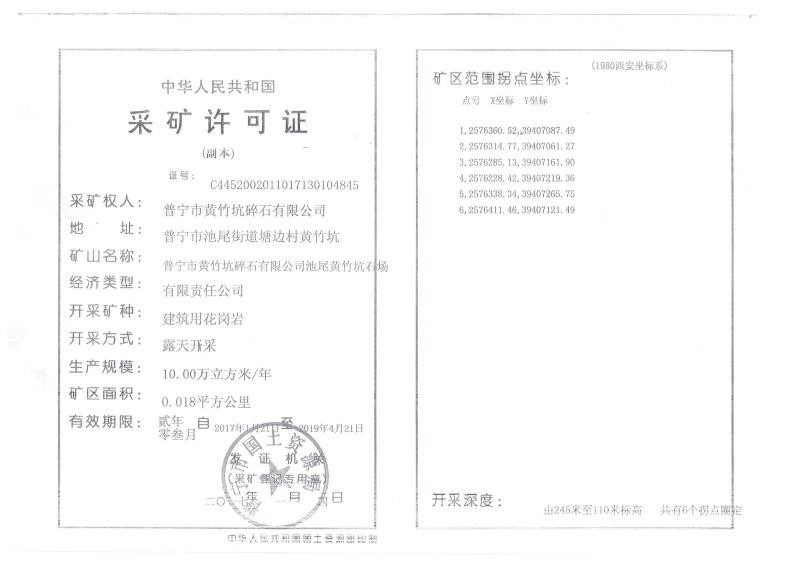 普寧市黃竹坑碎石有限公司位于我市池尾街道塘邊村黃竹坑的建筑用花崗巖礦采礦許可證(證號:C4452002011017130104845)于2019年4月21日到期屆滿。礦區(qū)內(nèi)礦產(chǎn)資源消耗完畢,經(jīng)該公司申請,根據(jù)《礦產(chǎn)資源開采登記管理辦法》(國務(wù)院令第241號)規(guī)定,現(xiàn)注銷該采礦許可證。