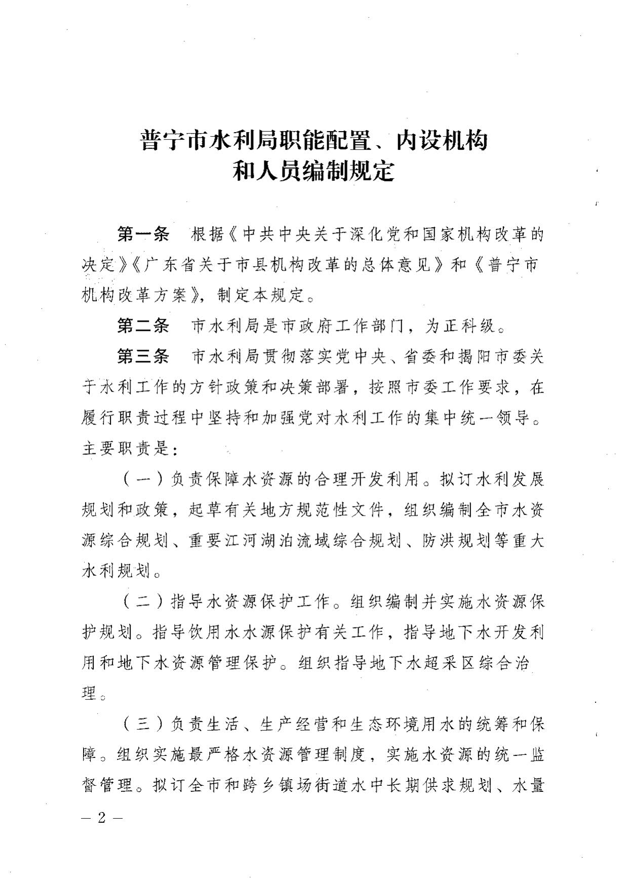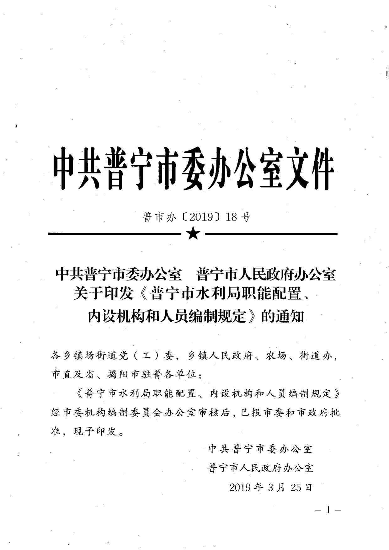| 名稱: | 關(guān)于印發(fā)《普寧市水利局職能配置、內(nèi)設(shè)機(jī)構(gòu)和人員編制規(guī)定》的通知 | ||