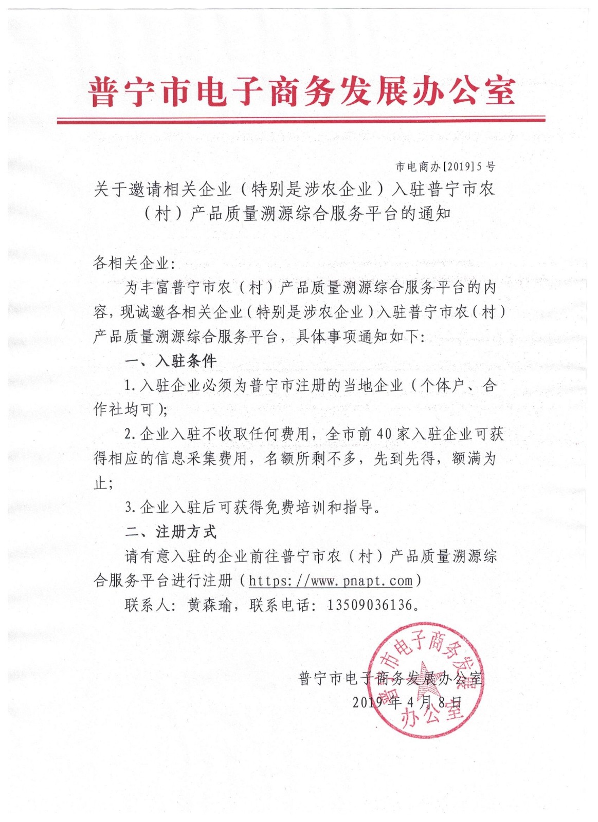 關(guān)于邀請(qǐng)相關(guān)企業(yè)(特別是涉農(nóng)企業(yè))入駐普寧市農(nóng)(村)產(chǎn)品質(zhì)量溯源綜合服務(wù)平臺(tái)的通知