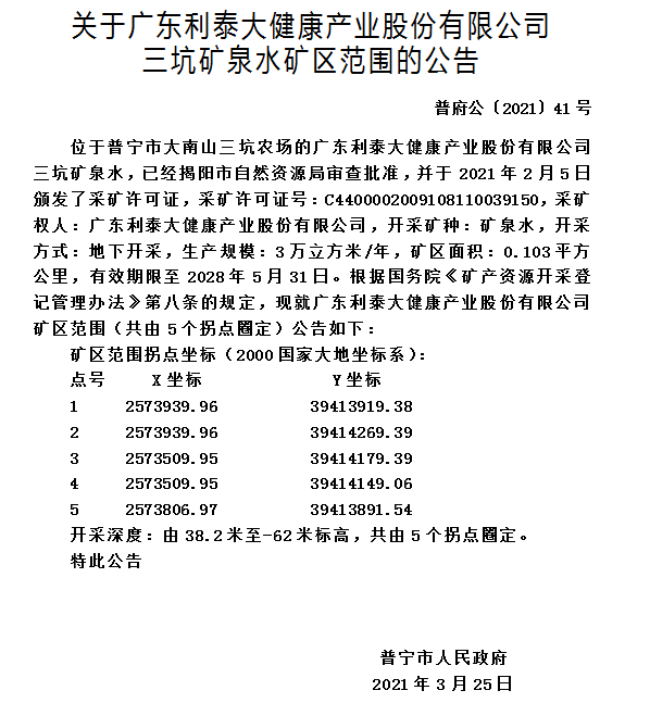 關(guān)于廣東利泰大健康產(chǎn)業(yè)股份有限公司三坑礦泉水礦區(qū)范圍的公告