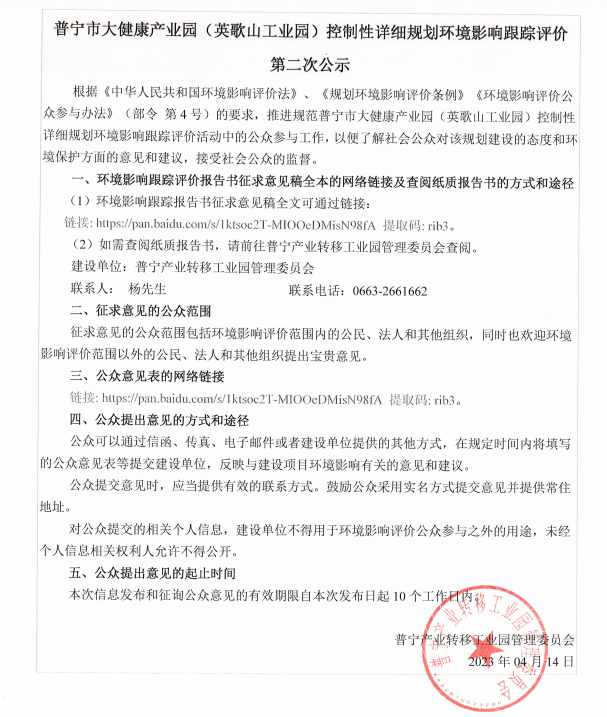 普寧市大健康產(chǎn)業(yè)園 (英歌山工業(yè)園)控制性詳細(xì)規(guī)劃環(huán)境影響跟蹤評價第二次公示