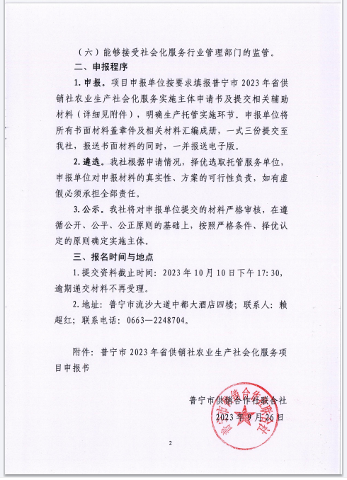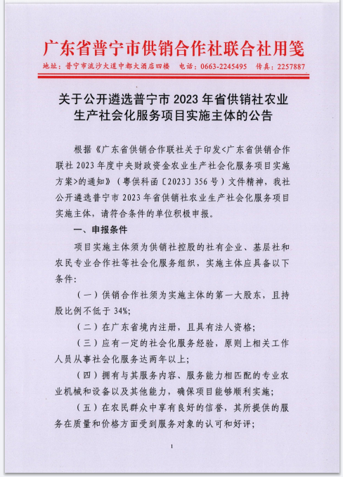關(guān)于公開遴選普寧市2023年省供銷社農(nóng)業(yè)生產(chǎn)社會化服務(wù)項目實施主體的公告