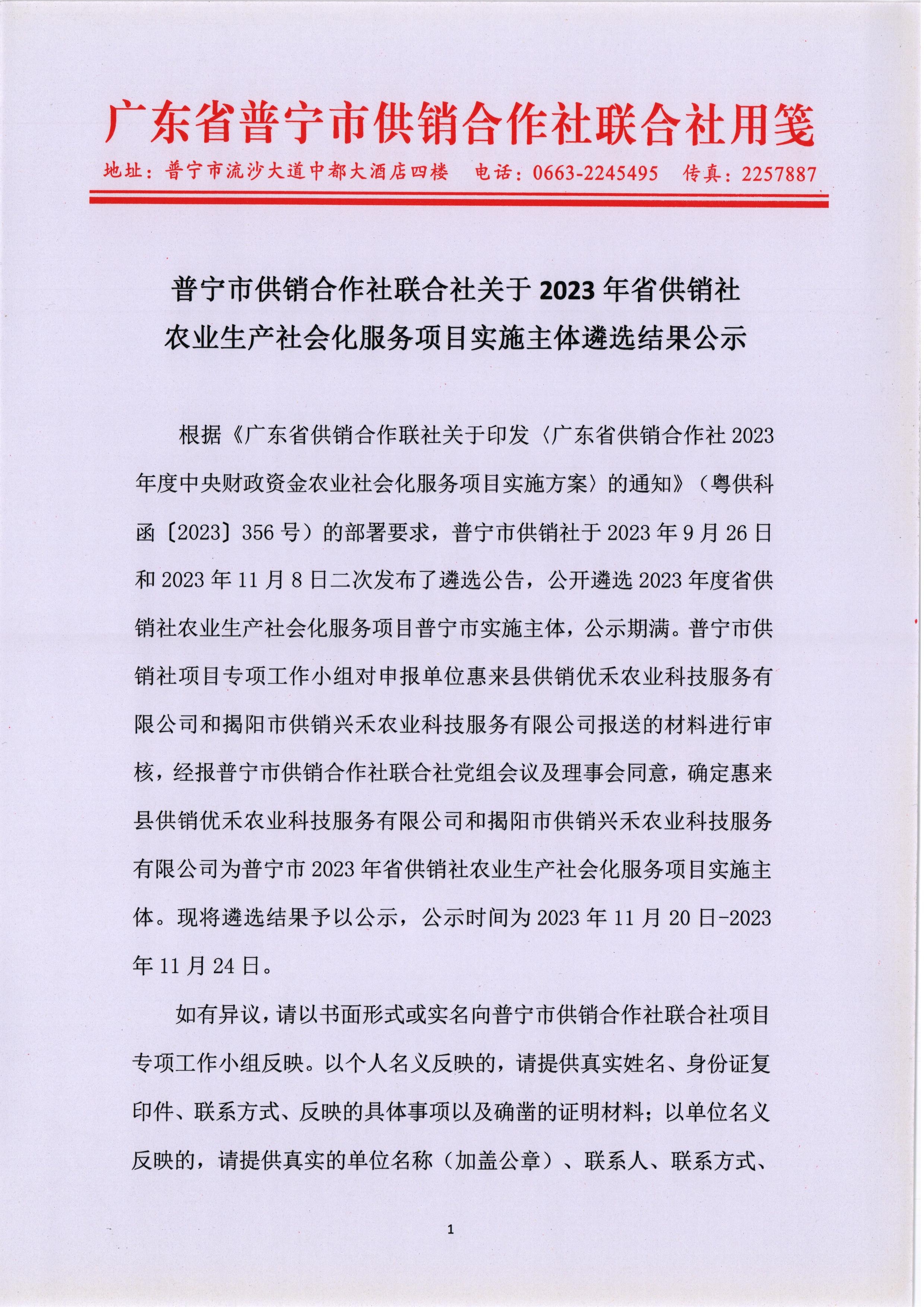 普寧市供銷合作社聯(lián)合社關(guān)于2023年省供銷社農(nóng)業(yè)生產(chǎn)社會(huì)化服務(wù)項(xiàng)目實(shí)施主體遴選結(jié)果公示