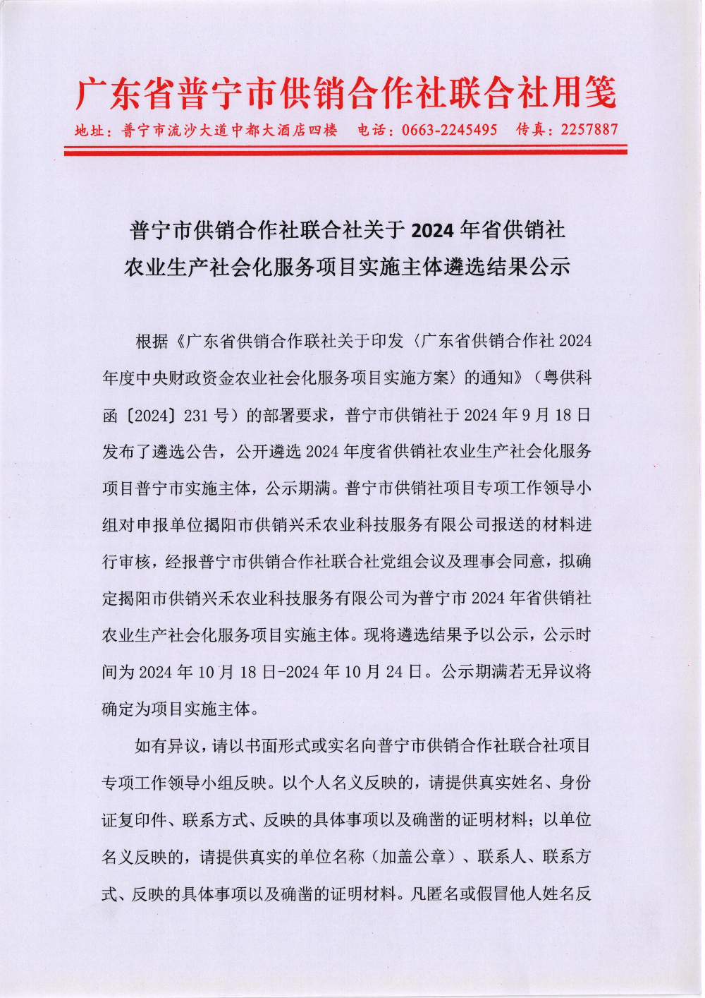 普寧市供銷(xiāo)合作社聯(lián)合社關(guān)于2024年省供銷(xiāo)社農(nóng)業(yè)生產(chǎn)社會(huì)化服務(wù)項(xiàng)目實(shí)施主體遴選結(jié)果公示