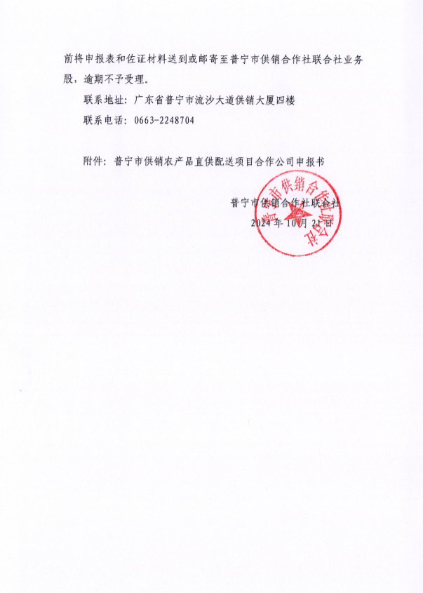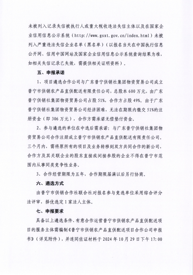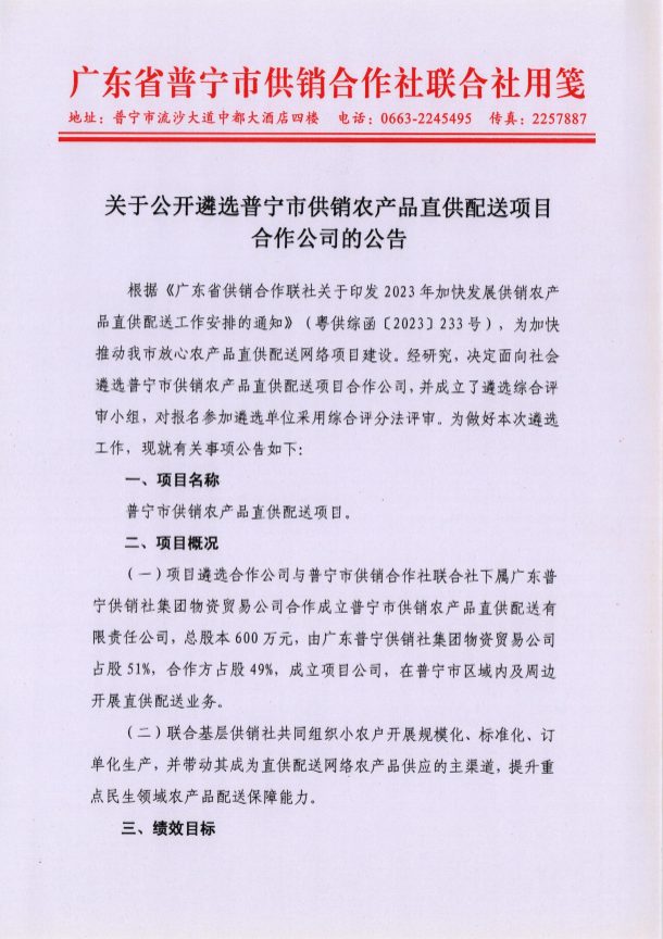 關(guān)于公開遴選普寧市供銷農(nóng)產(chǎn)品直供配送項(xiàng)目合作公司的公告