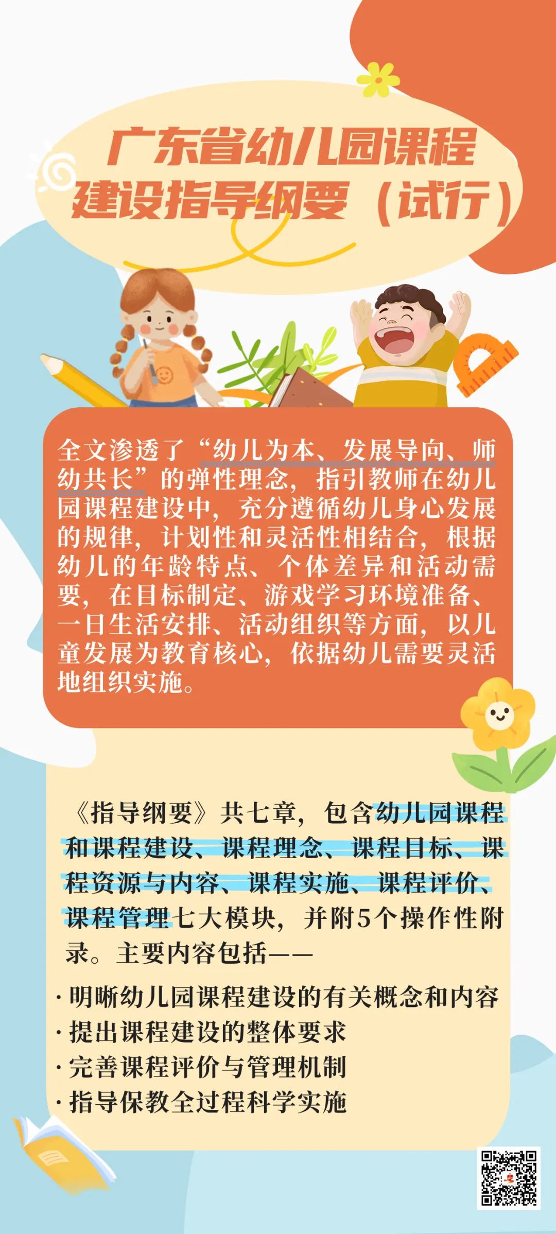 為深入貫徹落實《中華人民共和國學前教育法》《中共中央 國務(wù)院關(guān)于學前教育深化改革規(guī)范發(fā)展的若干意見》《幼兒園工作規(guī)程》《3-6 歲兒童學習與發(fā)展指南》《幼兒園保育教育質(zhì)量評估指南》和《廣東省幼兒園一日活動指引(試行)》等文件精神,立足廣東實際,科學指導廣東省幼兒園課程建設(shè),全面提升幼兒教師課程建設(shè)能力,不斷改進和優(yōu)化幼兒園教育過程,提高幼兒園保教質(zhì)量,省教育廳組織專家在廣泛征求各方面的意見的基礎(chǔ)上,研究制定了《廣東省幼兒園課程建設(shè)指導綱要(試行)》(以下簡稱《指導綱要》),并對貫徹落實《指導綱要》有關(guān)工作提出要求。