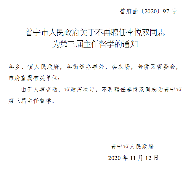 普寧市人民政府關(guān)于不再聘任李悅雙同志為第三屆主任督學(xué)的通知