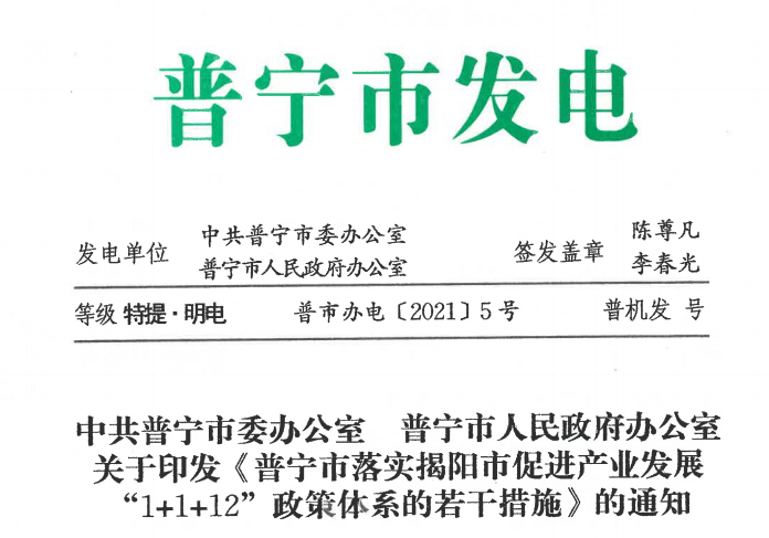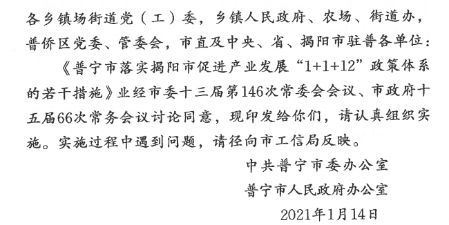 中共普寧市委辦公室 普寧市人民政府辦公室關(guān)于印發(fā)《普寧市落實揭陽市促進產(chǎn)業(yè)發(fā)展“1+1+12”政策體系的若干措施》的通知
