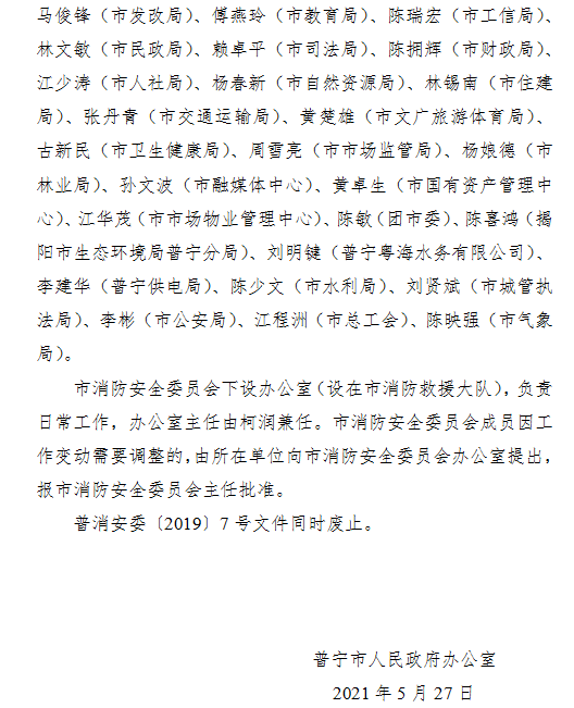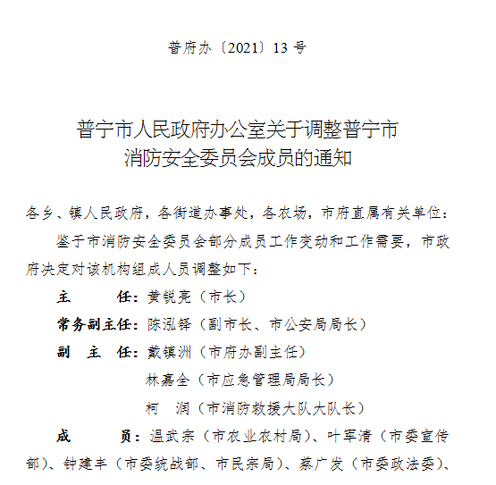 普寧市人民政府辦公室關(guān)于調(diào)整普寧市消防安全委員會成員的通知