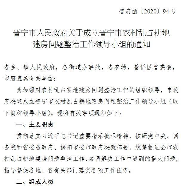 普寧市人民政府關(guān)于成立普寧市農(nóng)村亂占耕地建房問(wèn)題整治工作領(lǐng)導(dǎo)小組的通知