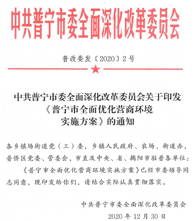 中共普寧市委全面深化改革委員會關(guān)于印發(fā)《普寧市全面優(yōu)化營商環(huán)境實(shí)施方案》的通知