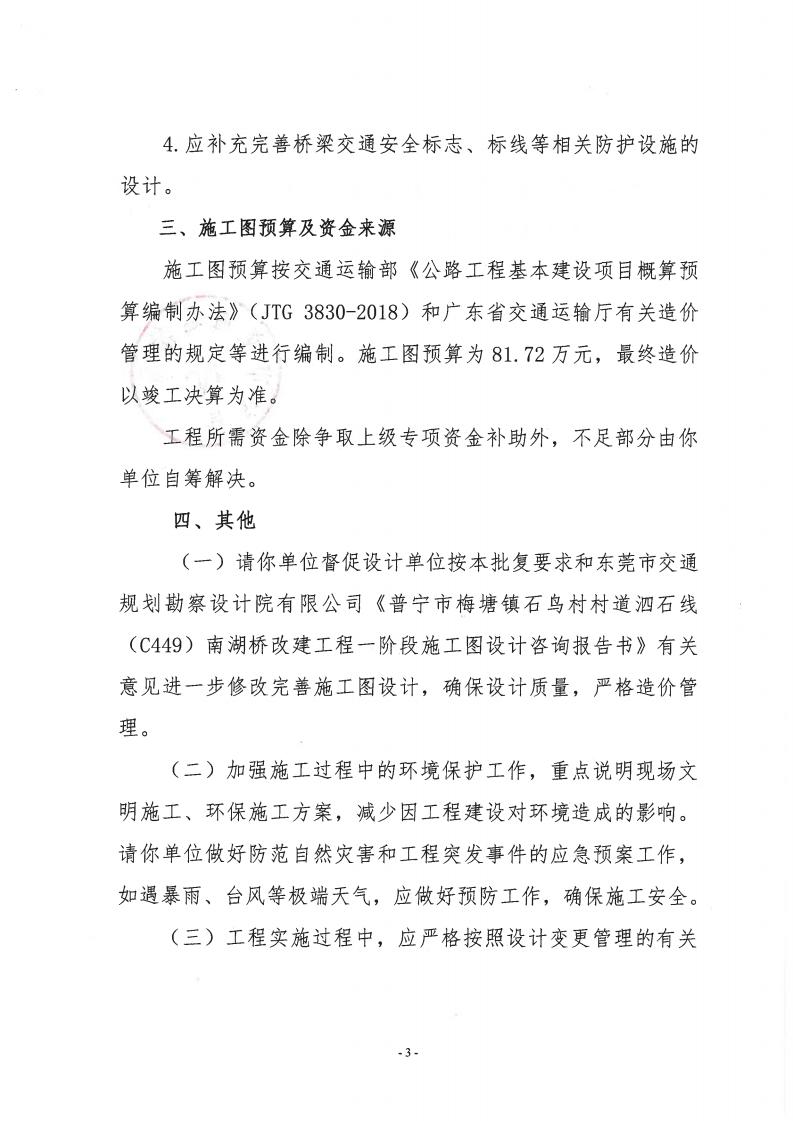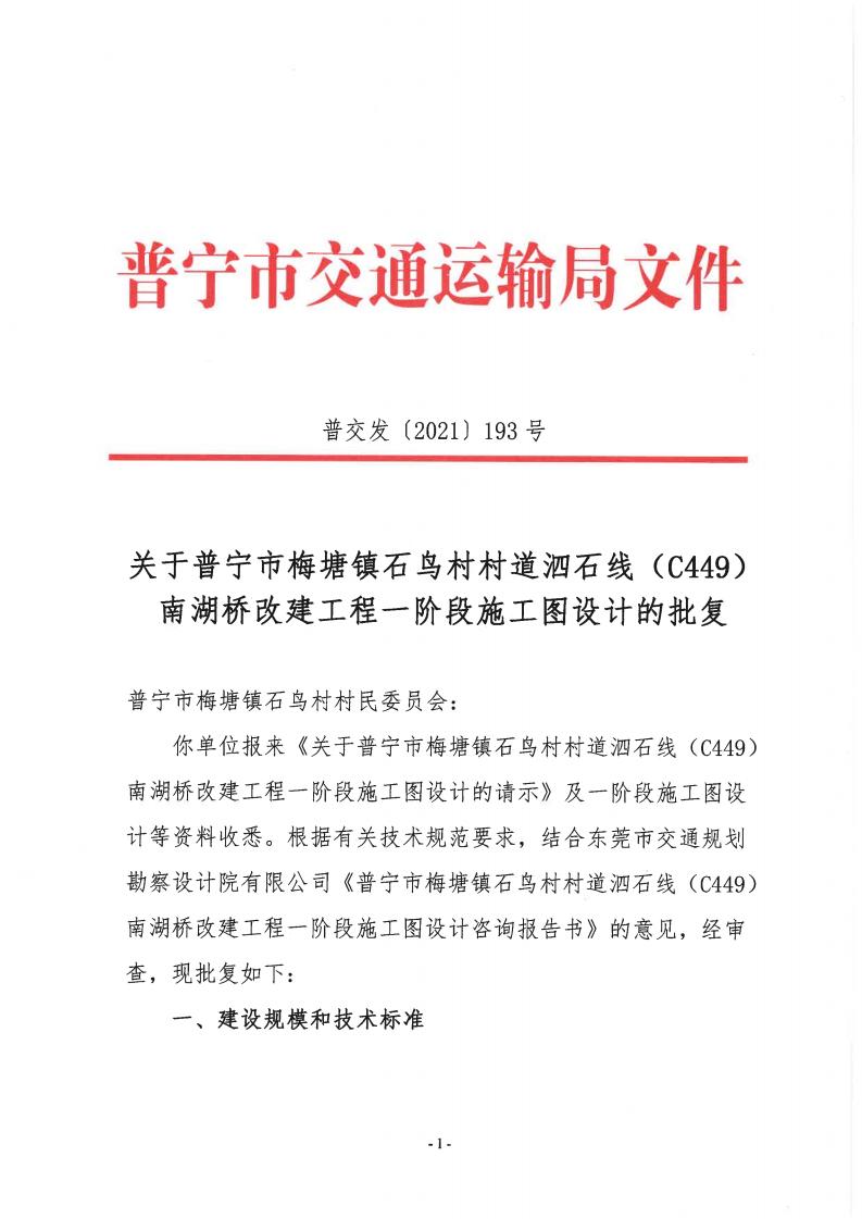關(guān)于普寧市梅塘鎮(zhèn)石鳥(niǎo)村村道泗石線(C449)南湖橋改建工程一階段施工圖設(shè)計(jì)的批復(fù)