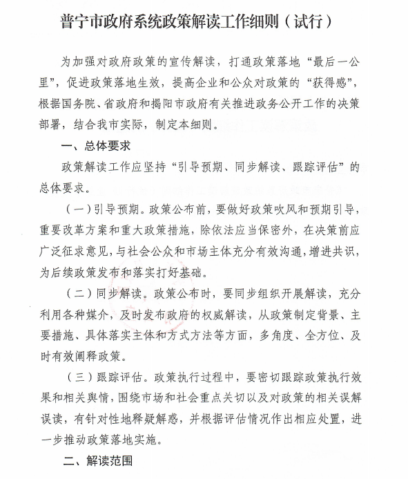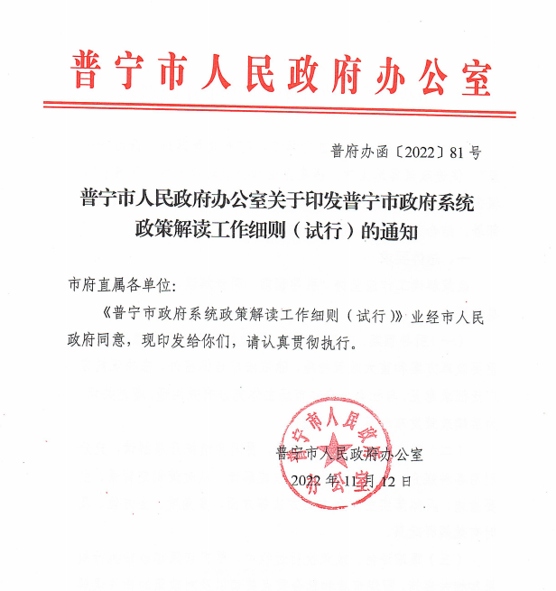 普寧市人民政府辦公室關(guān)于印發(fā)普寧市政府系統(tǒng)政策解讀工作細(xì)則(試行)的通知